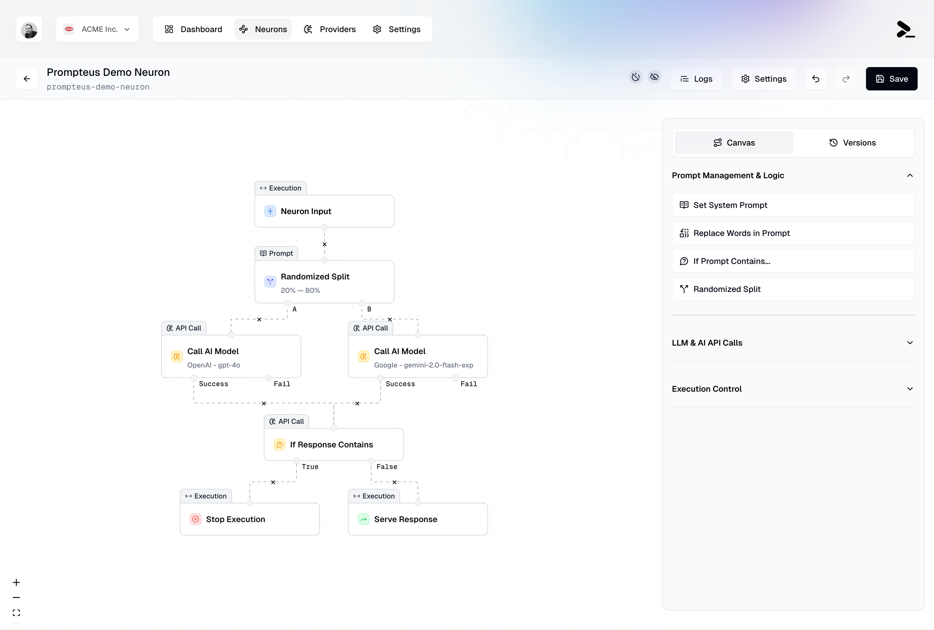 Create AI workflows in Prompteus and deploy them as secure, standalone APIs—ready to be called from any application, so you can offload all your AI logic with ease. Go from concept to production in minutes with our visual editor.